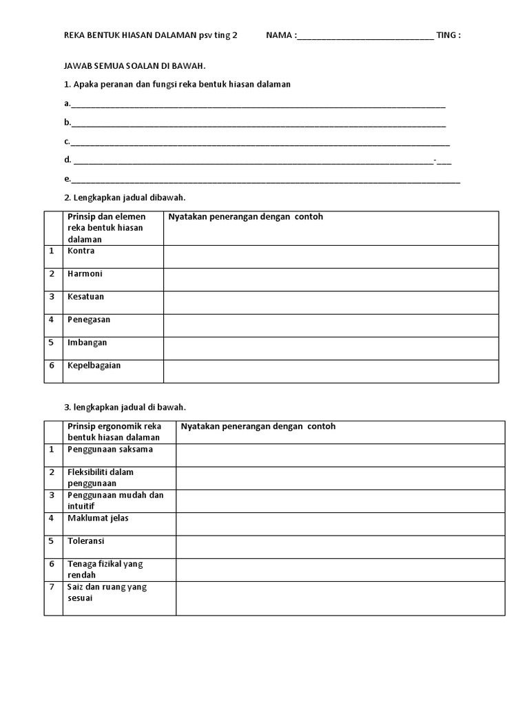 Psv Peranan Pereka Bentuk Hiasan Dalaman Tingkatan 3 Worksheet